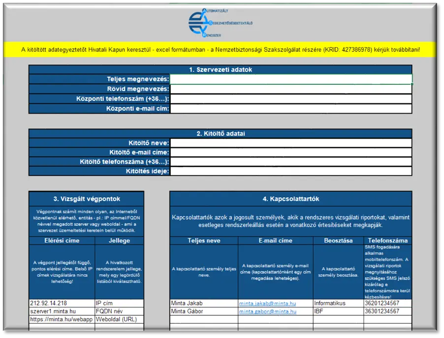 Az adategyeztető dokumentum rögzíti mindazon információkat, melyek szükségesek az ASR-be való felvételhez, a végpontok vizsgálatának műszaki konfigurálásához, valamint a vizsgálati riportok, értesítések megfelelő és titkosított eljuttatásához a jogosult kapcsolattartók részére. Kérjük, hogy a dokumentumot az érintett szervezet Hivatali Kapujáról szíveskedjenek az NBSZ részére eljuttatni!